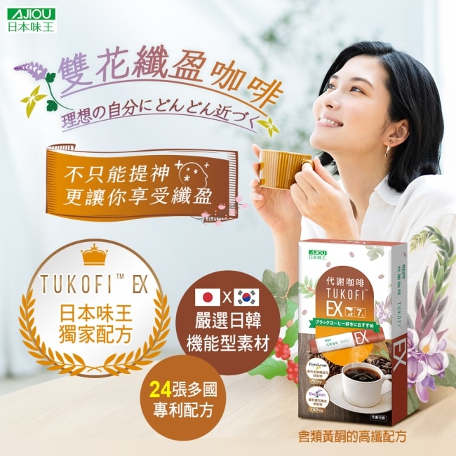 | 商品簡述 | 日本味王獨家專利雙花纖盈咖啡嚴選日韓功能性素材好喝、窈窕、更滿足健康需求。 |
