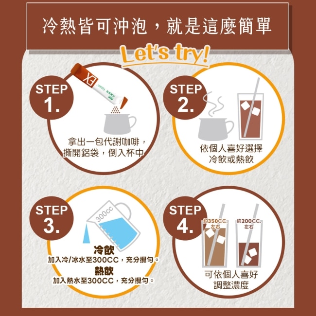 | 注意事項 | 1.建議每人每日咖啡因攝取量以不超過300毫克為上限本包裝每份咖啡因含73.5毫克孩童及孕婦慎用。 2.重大疾病及體質過敏者應先請教專業醫藥人員後選擇食用。 3.本產品非藥品供保健用罹病者仍需就醫。 | ||||||||