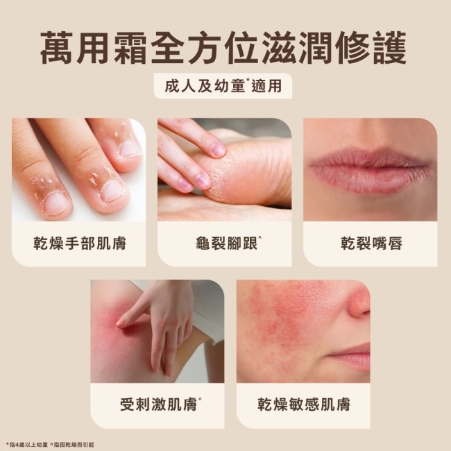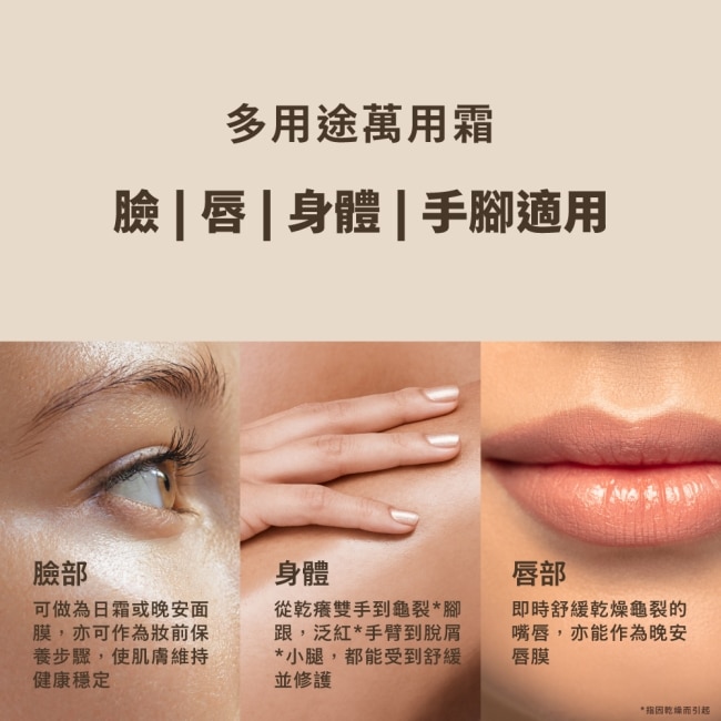 產品特色: 幫助保護肌膚並預防乾裂和舒緩因乾燥引起的龜裂、脫屑、泛紅、繃緊的肌膚和唇部