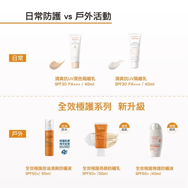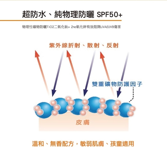 | 商品簡述 | 新物理性防曬成分(氧化鋅及二氧化鈦),具寬頻光防護功能,能隔離UVB.UVA對肌膚的傷害 |