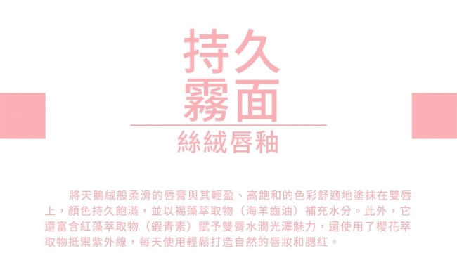 唇釉顏色持久飽滿並以褐藻萃取物(海羊齒油)補充水分。