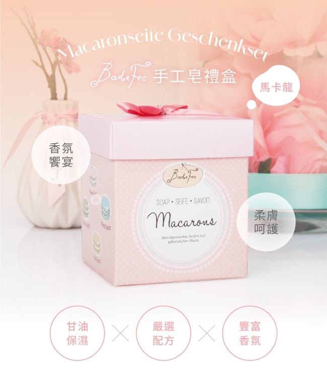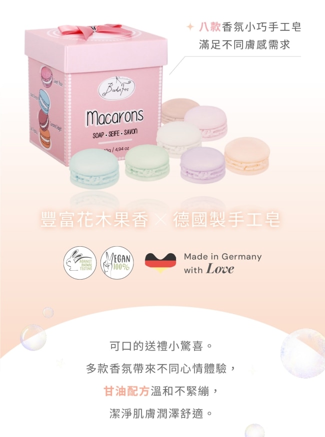 探索 BadeFee 的神奇馬卡龍香皂為您所愛的人送上一份特別的禮物這些可愛、方便的肥皂裝在時尚設計的禮品盒中作為禮物贈送時更加美觀。每個盒子裡有八塊馬卡龍形狀的肥皂它們不僅外觀賞心悅目而且散發著令人愉悅的香味。