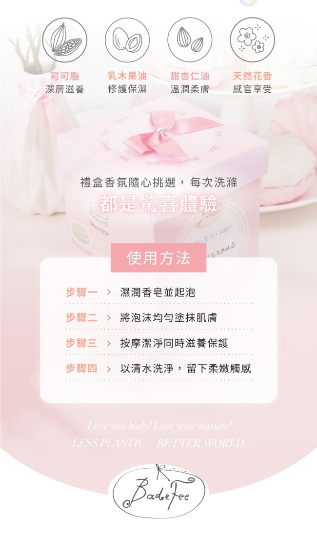 | 商品簡述 | 粉嫩甜點造型香皂溫和潔膚、香氣療癒純素配方不含微塑膠送禮自用皆宜。 |