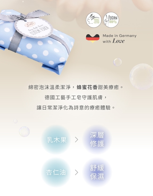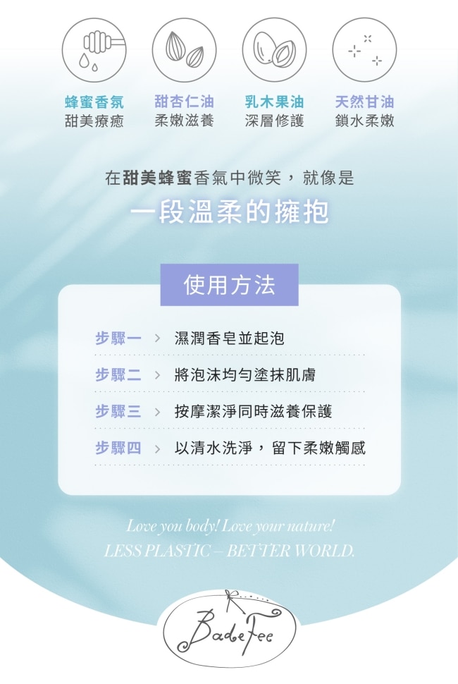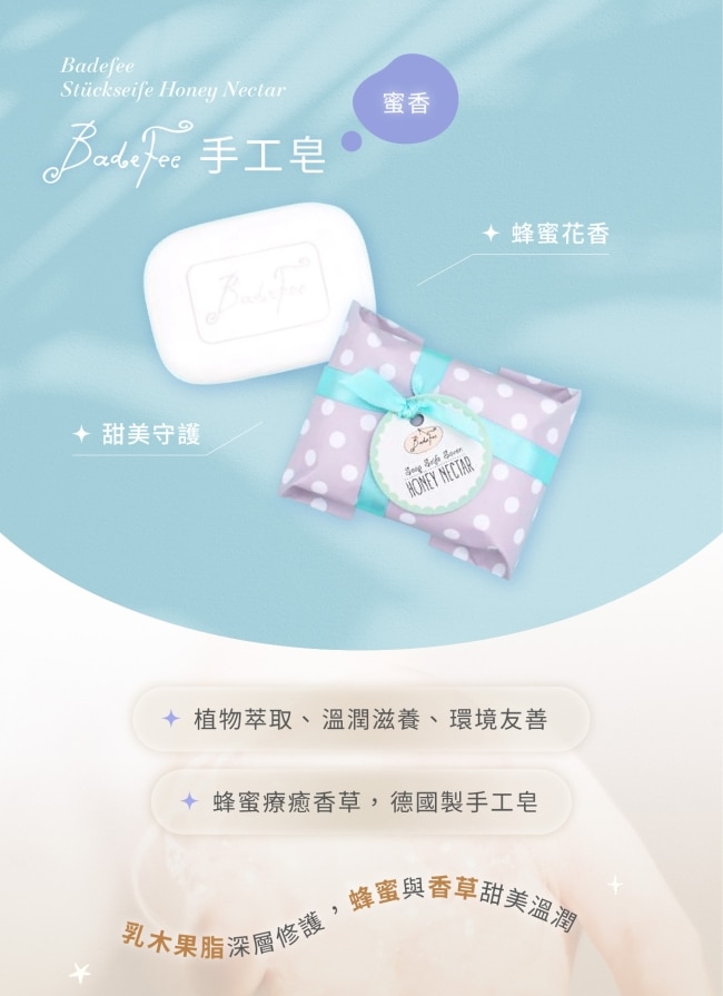 | 商品簡述 | Badefee 手工皂-蜜香 德國製純素手工皂蜂蜜香氣綿密泡沫洗後肌膚柔嫩不乾澀。 |