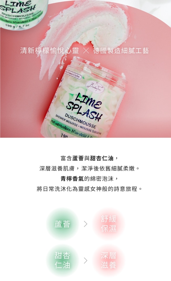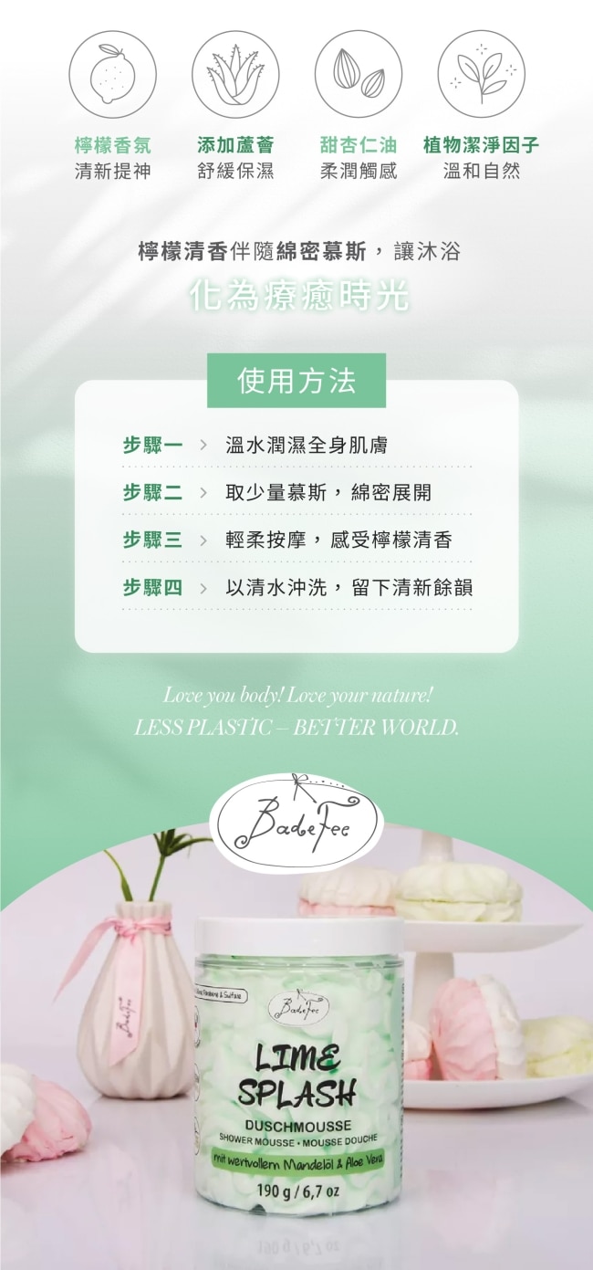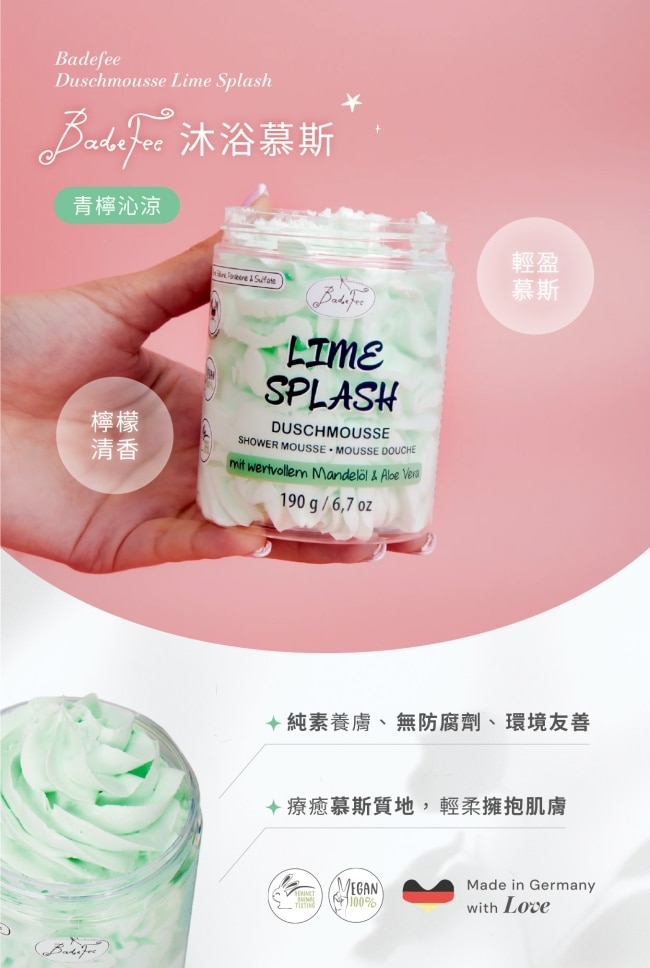 | 商品簡述 | BadeFee 沐浴慕斯青檸沁涼綿密泡沫輕柔包覆肌膚散發清新青檸香氣洗後清爽保濕喚醒夏日活力 |