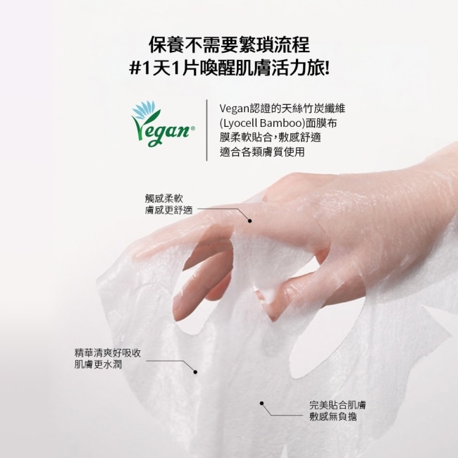 靜敷 10–20 分鐘後取下輕拍臉部至剩餘精華完全吸收。