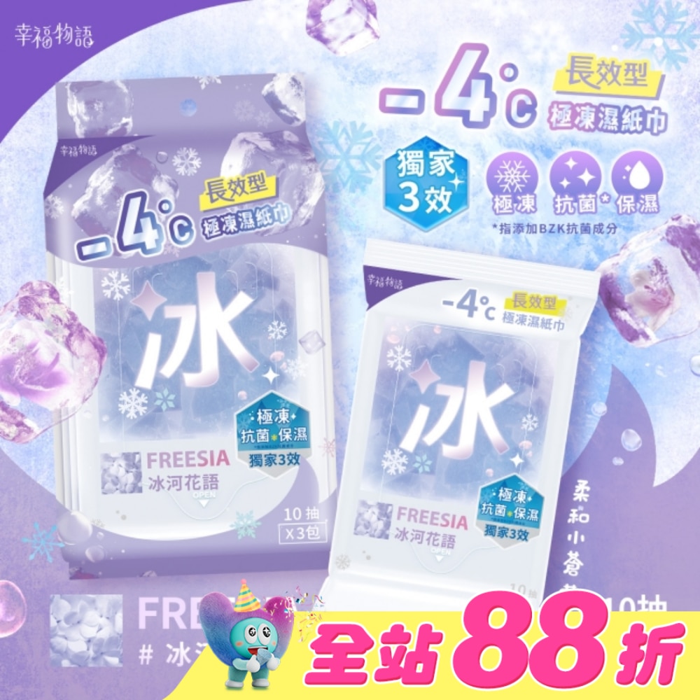 | 商品簡述 | 幸福物語 - 4°c極凍濕紙巾(10抽*3包)_冰河花語/小蒼蘭 |