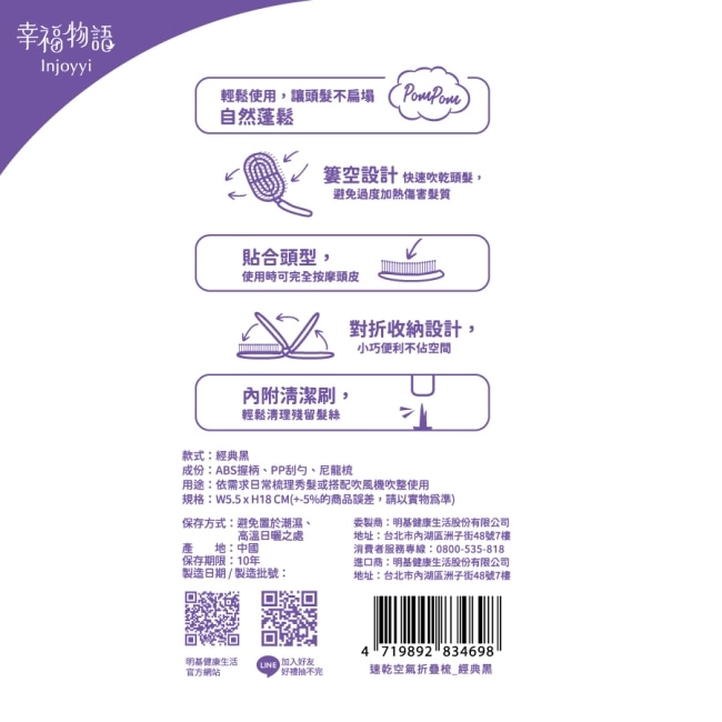 | 商品簡述 | Injoyyi速乾空氣折疊梳-經典黑 |