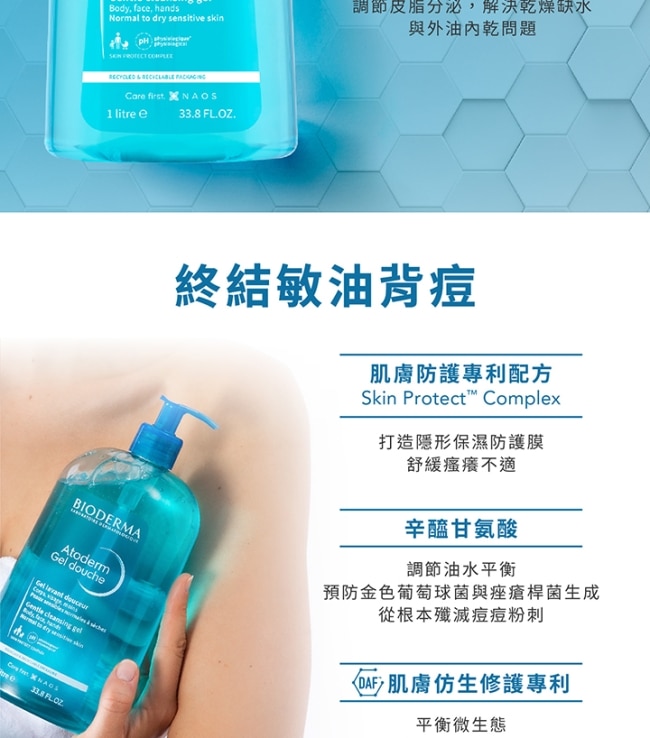 舒緩修復 終結敏油背痘肌膚防護專利配方舒緩搔癢不適。辛醯甘氨酸調節油水平衡改善背痘問題。DAFTM肌膚仿生修護專利平衡微生態重啟健康肌膚狀態。