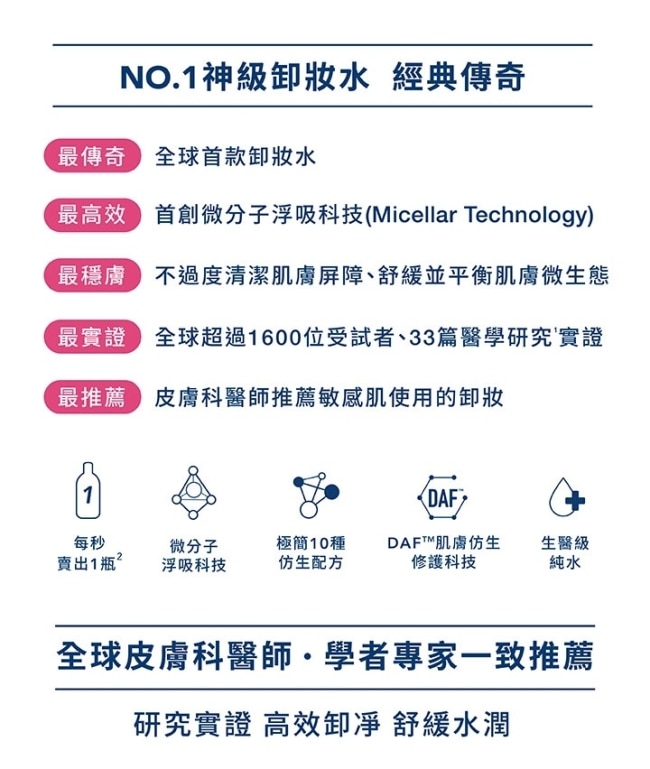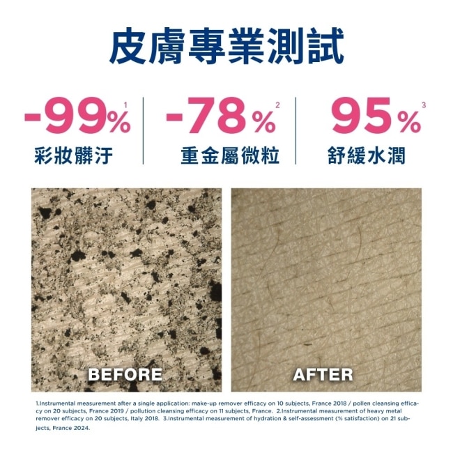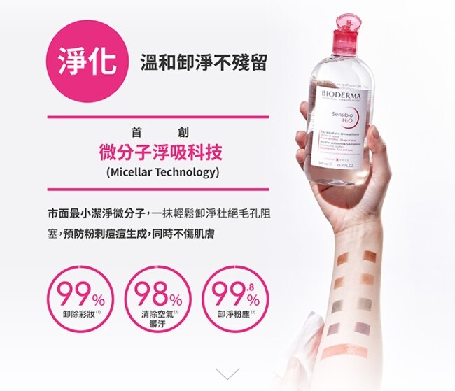 【高效清潔】業界首創微分子浮吸科技(Micellar Technology)打造市面最小潔淨微分子一抹浮吸帶走彩妝、空汙PM2.5、重金屬等微粒預防毛孔阻塞、粉刺生成。