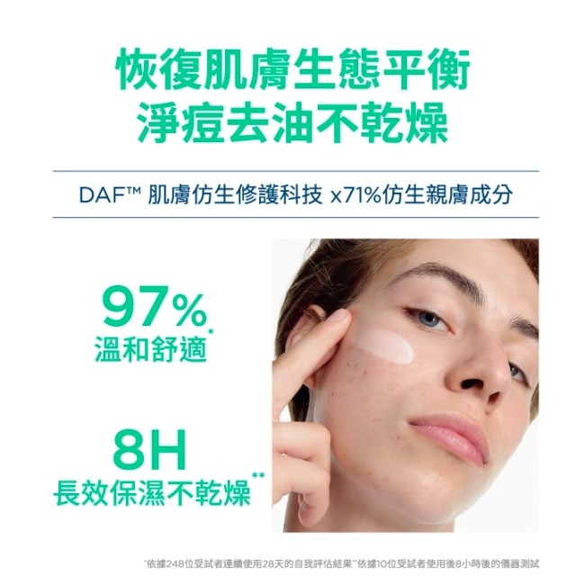 超修護8小時持久保濕,不刺激不脫皮雙重活性配方(10%蘋果酸酯&1.8%水楊酸) 協同作用, 深入皮膚表層及毛孔內部,搭配DAF™肌膚仿生修護科技,淨痘同步強化屏障,不刺激不脫皮