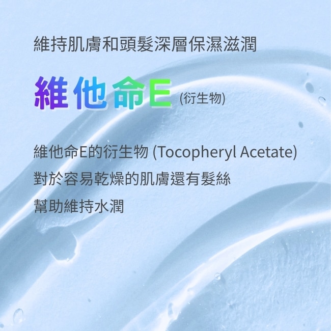 肌膚保濕: 主要用途為肌膚、髮絲補水保濕。