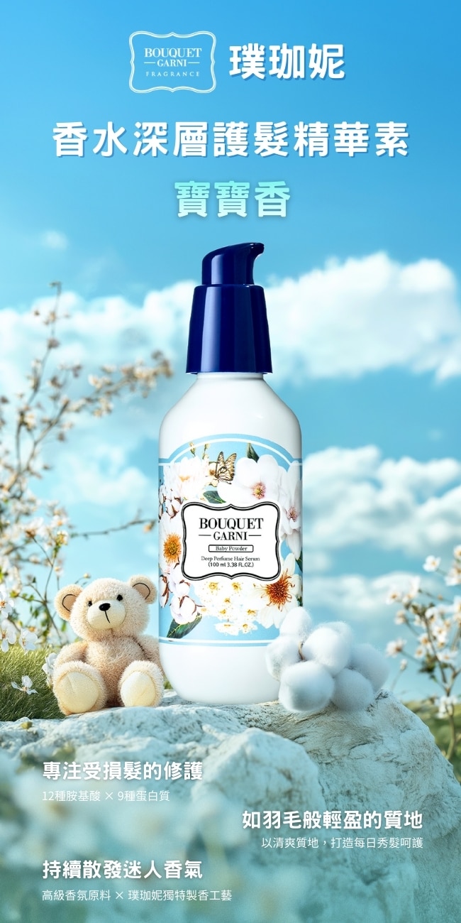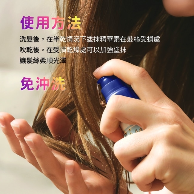 | 商品簡述 | 洗髮後用毛巾壓乾至濕髮狀態時使用此時毛鱗片張開養分更易吸收吹乾後能有效降低毛躁。 |