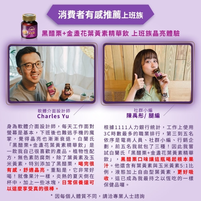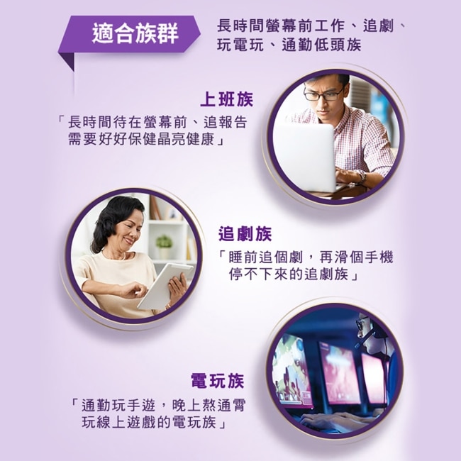 1. 葉黃素與玉米黃素5:1比例與美國國家衛生研究所實驗證實的比例相同能為學生族、上班族、銀髮族等長時間大量閱讀或追劇族群提供有效的晶亮首選。
