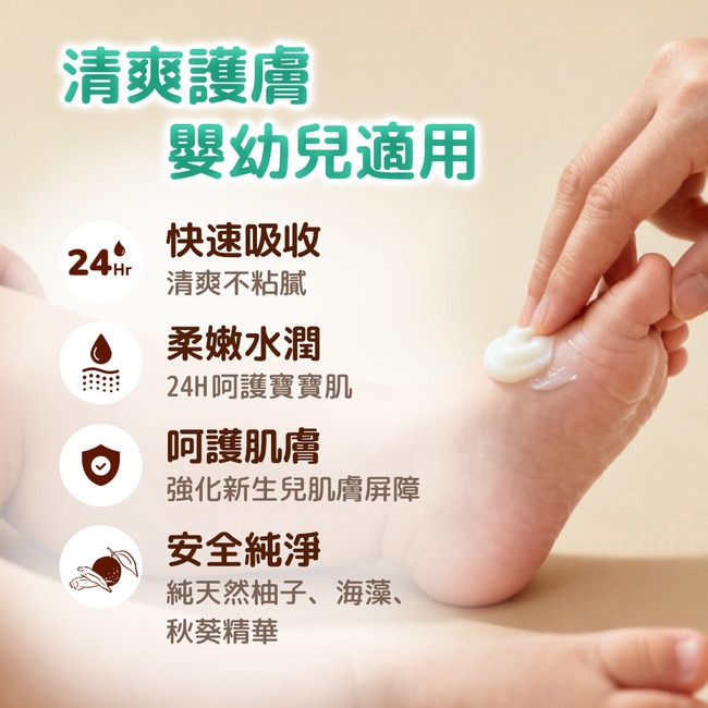 嬰兒潤膚乳--專為嬌嫩肌膚設計適合新生兒使用。蘊含柚子神經酰胺、海藻與秋葵萃取深層保濕並強化肌膚屏障。有效鎖水維持肌膚柔嫩水潤。溫和涼感配方舒緩肌膚不適。不添加矽靈、防腐劑、礦物油與酒精成分單純安心。舒緩香氛設計陪伴寶寶安心入睡。