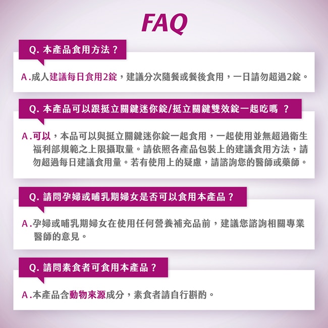備註欄1.孕婦及授乳婦在食用本產品前,請洽醫藥專業人員。 2.使用後請蓋緊,並置於乾燥陰涼及兒童無法取得之處。 3.若不慎食用過量,應立即停用並諮詢醫師。4.若您有特殊情況或正在服用任何藥物,使用前請先諮詢醫師。5.若您食用其他營養補充品,請詳讀標示是否有相同成分。