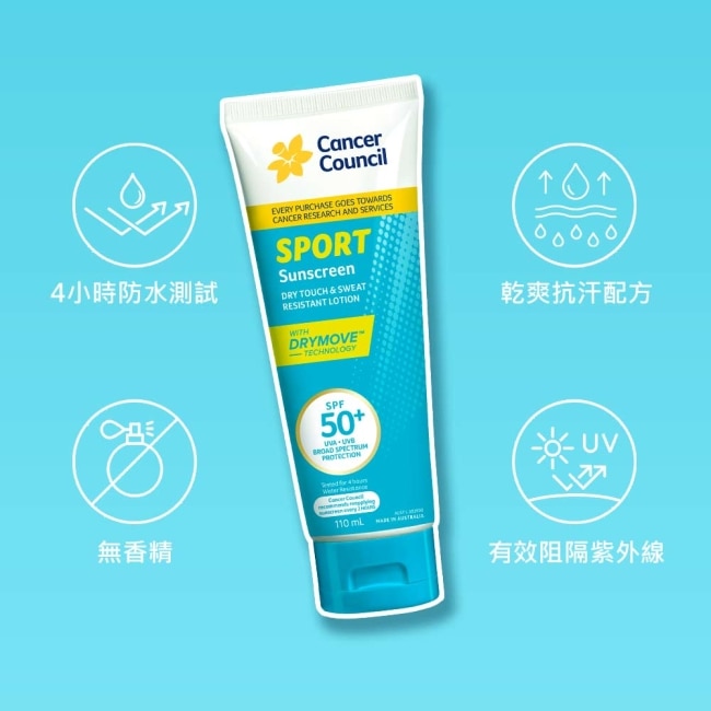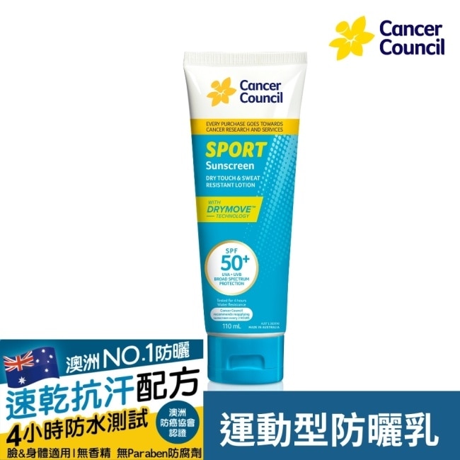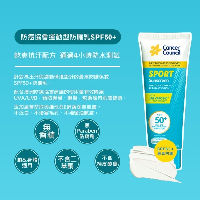 乾爽抗汗配方,針對易出汗與運動情境設計的最高防曬係數SPF50+防曬乳,配合澳洲防癌協會建議的使用量有效隔絕UVA/UVB,預防曬黑、曬傷,幫助維持肌膚健康。添加蘆薈萃取與維他命E舒緩保濕肌膚。不泛白、不堵塞毛孔、不殘留油膩感。