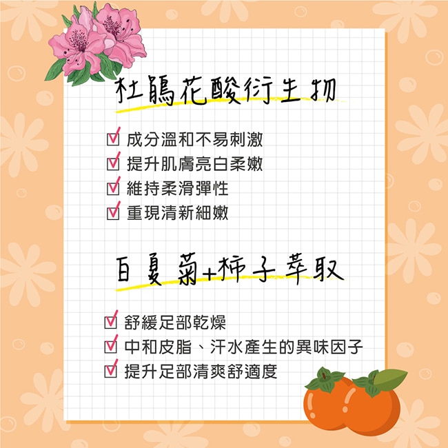來自法國海岸的白夏菊能舒緩足部乾燥搭配富含柿單寧的柿子萃取能中和皮脂、汗水產生的異味因子提升足部清爽舒適度