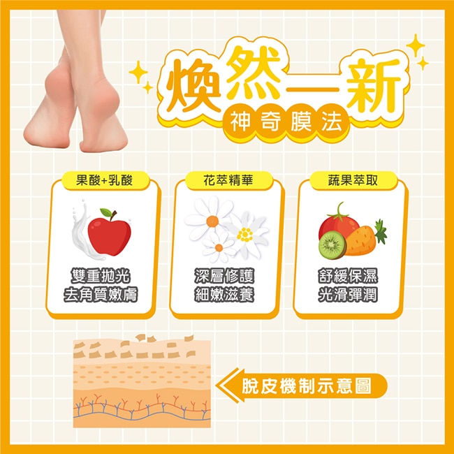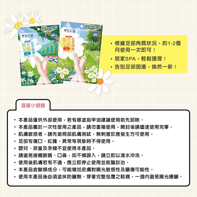 全方位護理溫和浸潤代謝老厚角質脫去老舊死皮同時注入花萃營養保濕嫩白呵護雙足無礦物油、人工色素、MI防腐劑、Paraben防腐劑