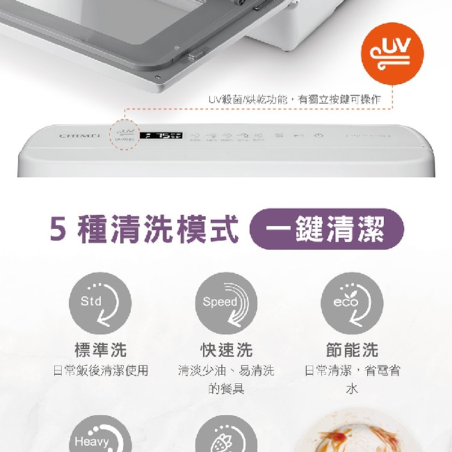 6組模式模式標準洗、快速洗、強力洗、節能洗(ECO)、蔬果洗、UV高溫殺菌