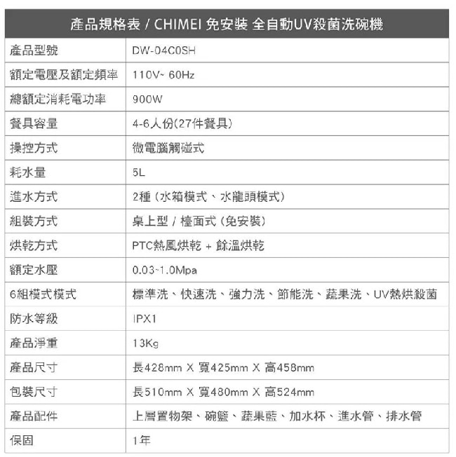 CHIMEI奇美免安裝全自動UV洗碗機 DW-04C0SH