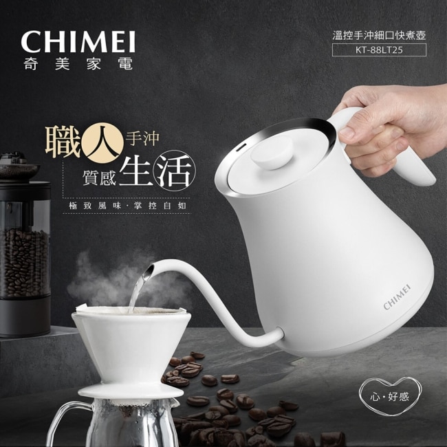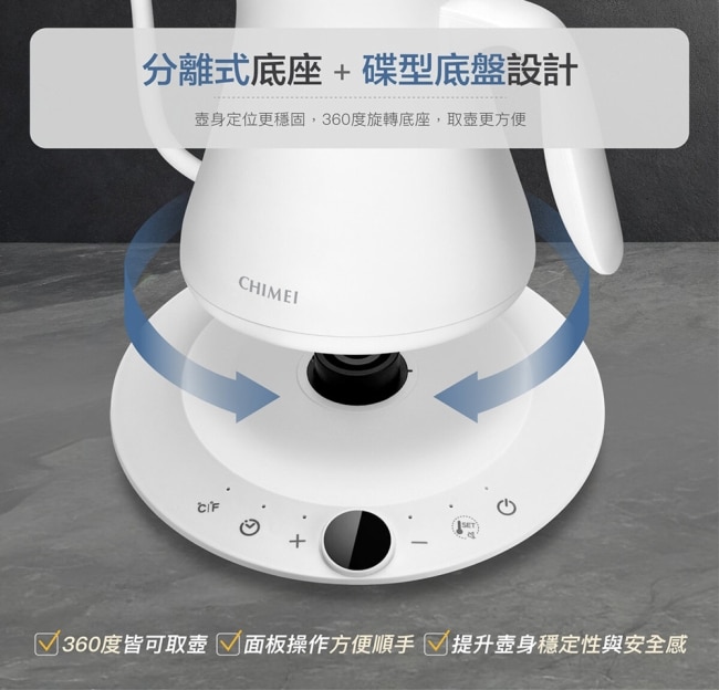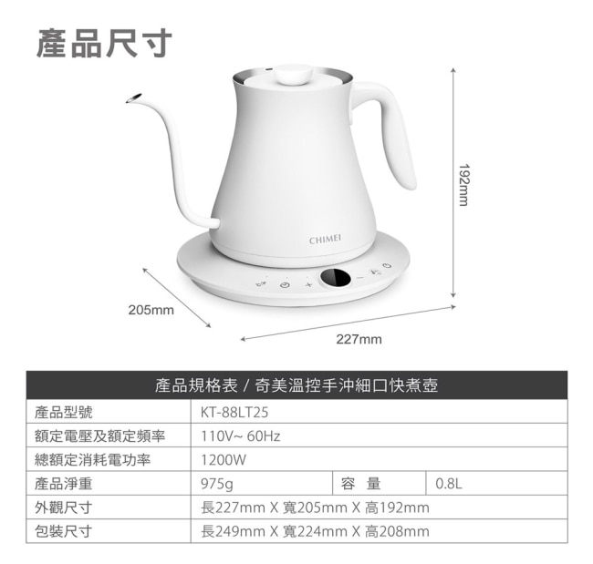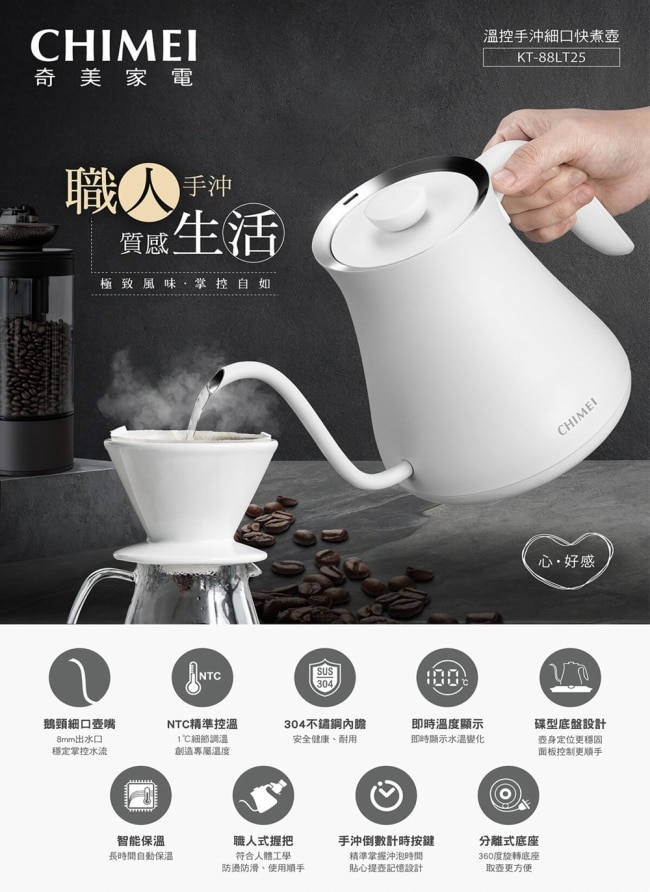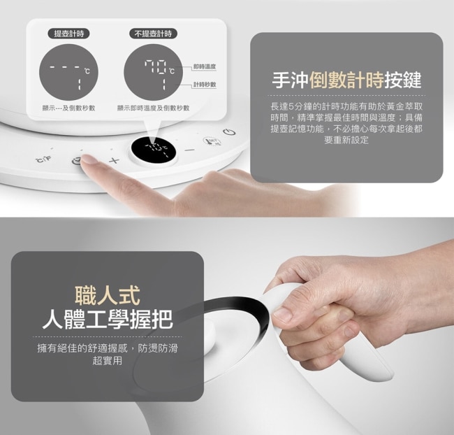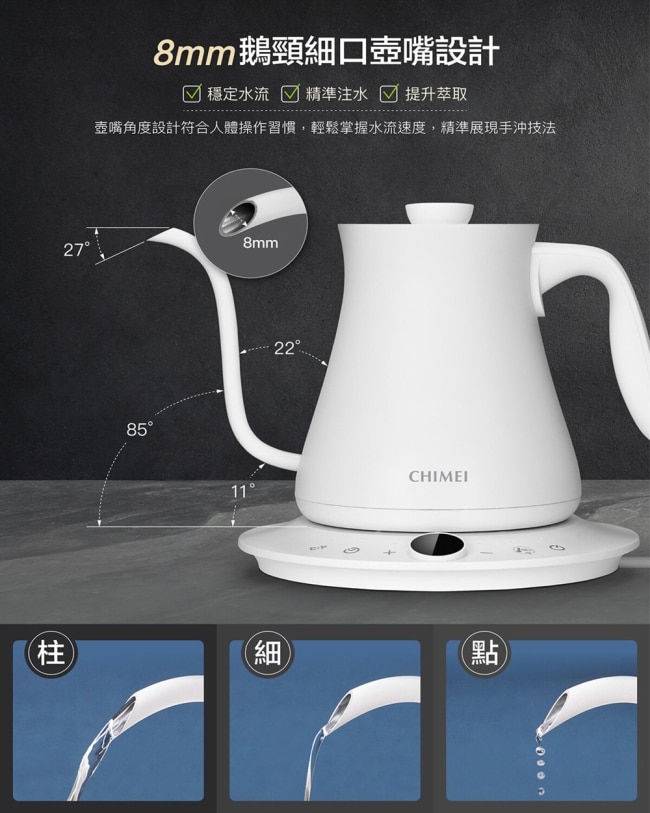 | 商品簡述 | 8mm鵝頸細口壺嘴設計技法自由切換展現手沖魅力SUS304不鏽鋼內膽即時溫度顯示 |