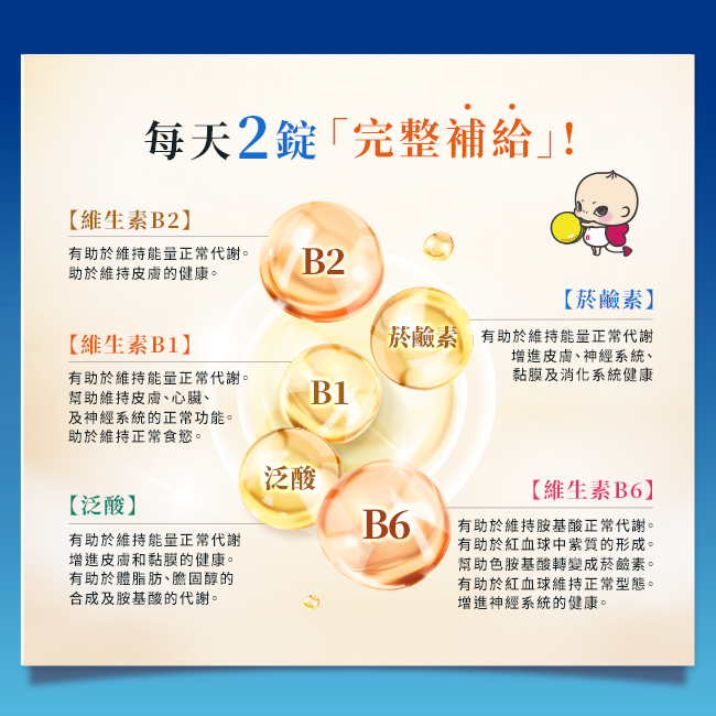 俏正美BB Plus糖衣錠有高含量維生素B1和B2。添加維生素B2有助於維持能量正常代謝搭配維生素B1幫助維持皮膚、心臟的正常功能以及維生素B6有助於維持胺基酸正常代謝和增進神經系統的健康菸鹼素及泛酸則可增進皮膚和黏膜的健康。貼心彈蓋包裝簡易取用小顆的糖衣錠設計讓您方便食用。