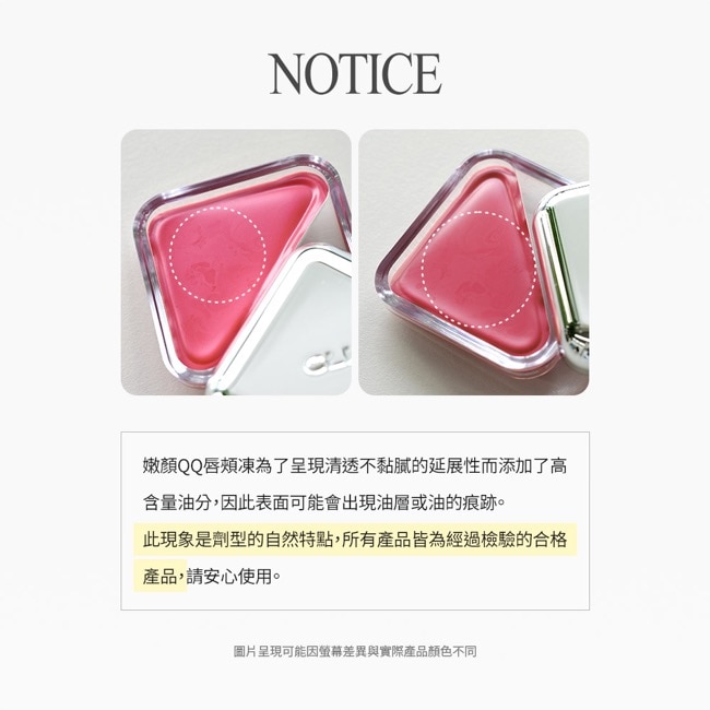 注意事項開封後請於一年內使用完畢。使用時若有肌膚不適請暫停使用並詢問皮膚科醫師。避免高溫、陽光直射、重力撞擊等外力因素損傷產品。使用後建議用眼唇專用卸妝產品卸除彩妝。