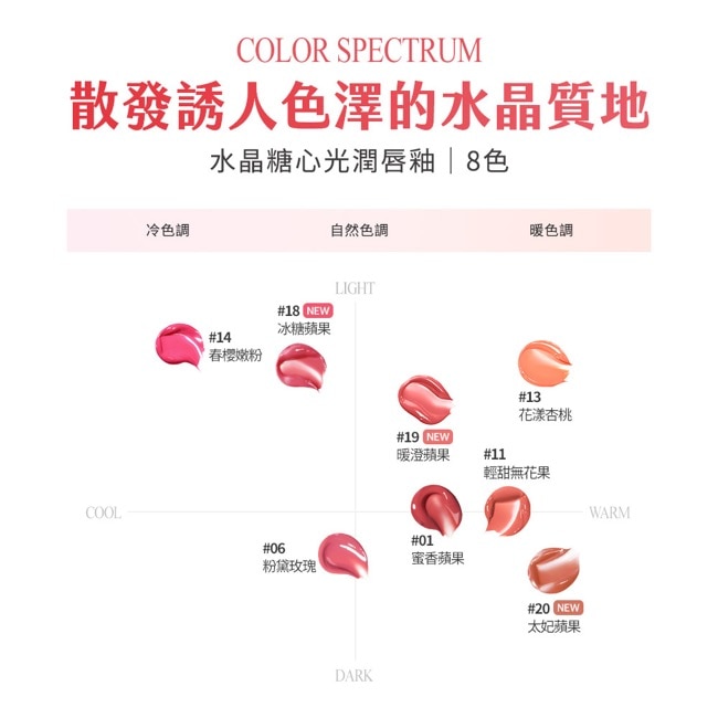 產品特色蘋果限定款瓶蓋嵌入精緻小蘋果讓上妝變成療癒身心的小確幸誘人水晶光澤質地添加潤澤保濕成分輕鬆打造''質感水光唇"搭配百搭不踩雷色調秒變韓系歐膩
