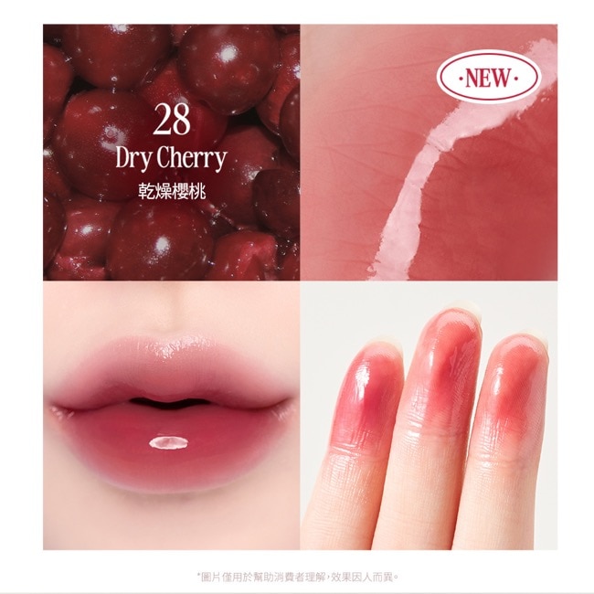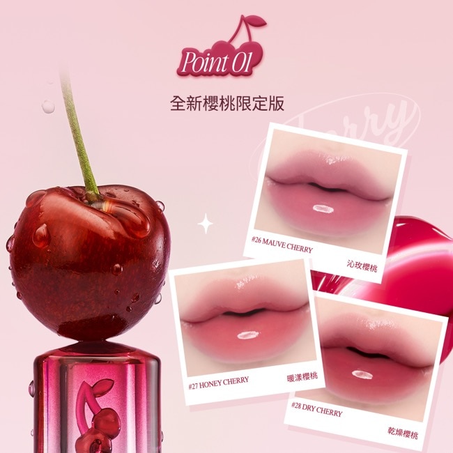 商品特色櫻桃限定款瓶蓋嵌入精緻小櫻桃讓上妝變成療癒身心的小確幸誘人水晶光澤質地添加玫瑰萃取潤澤保濕成分輕鬆打造''質感水光唇"搭配百搭不踩雷色調秒變韓系歐膩