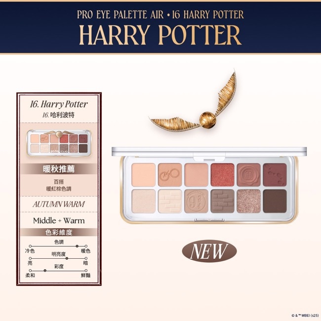 產品特色哈利波特限定版粉質細緻x色調百搭一抹進入魔法世界超精緻童趣光柵紙盒眼影盤上的吊飾呼應每個主角的故事金探子、愛情魔藥不採雷知性百搭眼影盤色調兼具收藏及實用價值。17妙麗格蘭傑為玫瑰粉色調靈感來自妙麗在火盃的考驗舞會上所穿的漸層連身裙其中每格顏色的名稱也都跟主角相關就像進入魔法學院中細節滿滿。