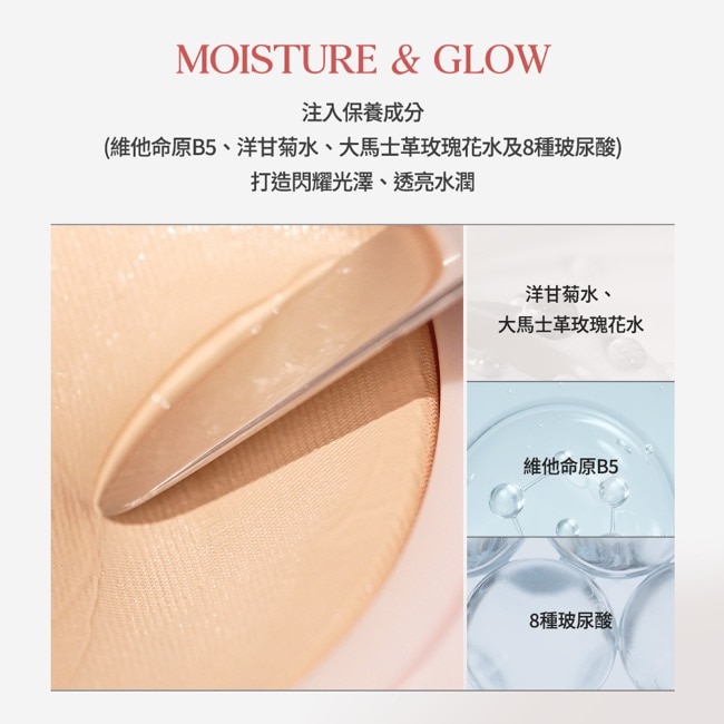 注入保養品成分(維他命原B5、洋甘菊水、大馬士革玫瑰花水及八種玻尿酸)打造閃耀光澤、