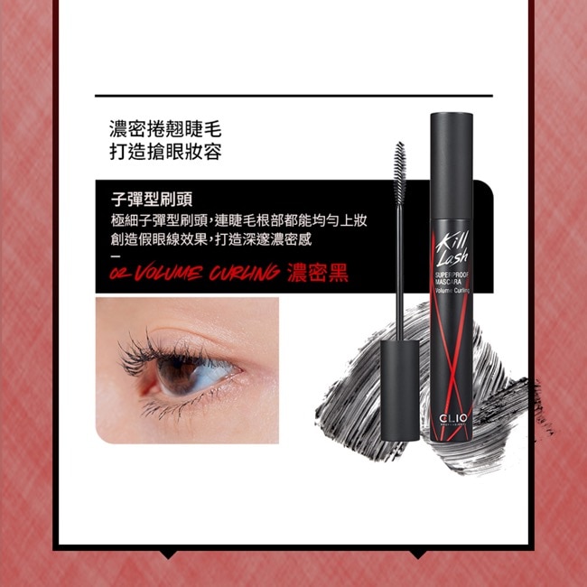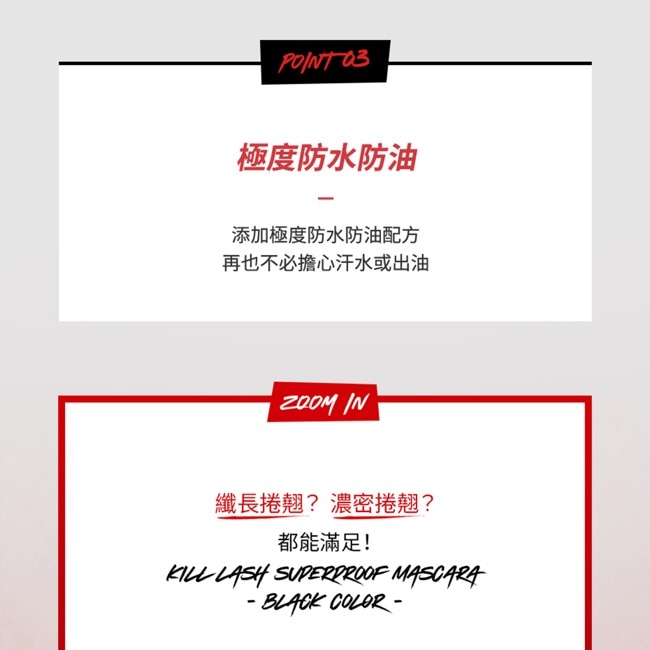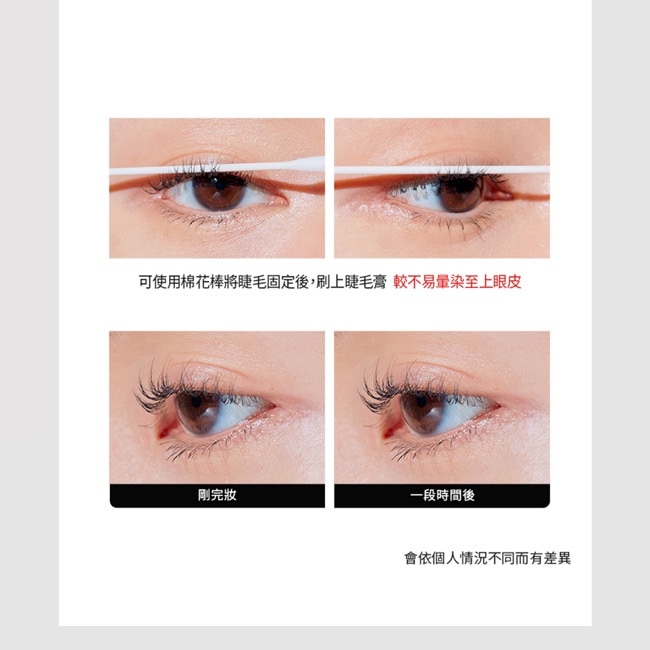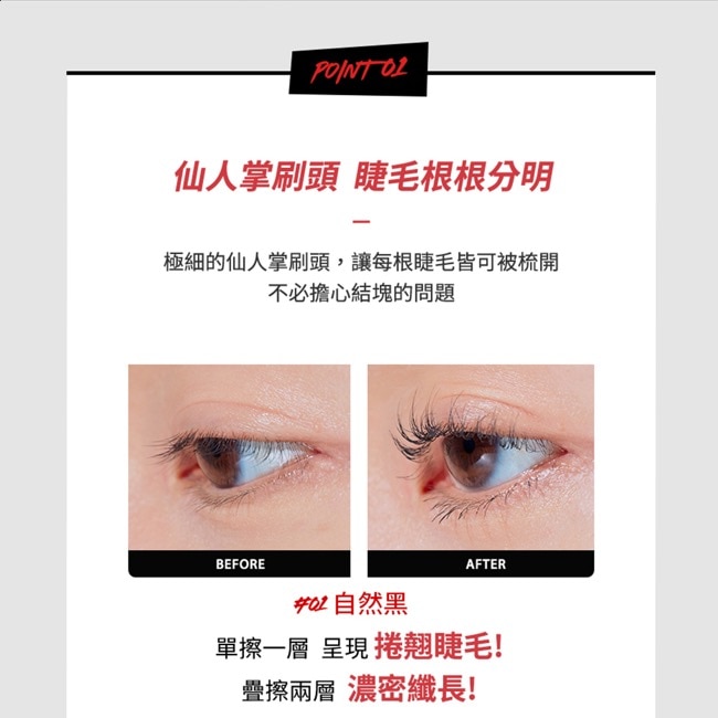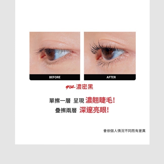 單擦一層呈現捲翹睫毛刷兩層讓睫毛更加濃密纖長防水防油設計讓睫毛膏更持久、不暈染整天都神采奕奕不變熊貓眼