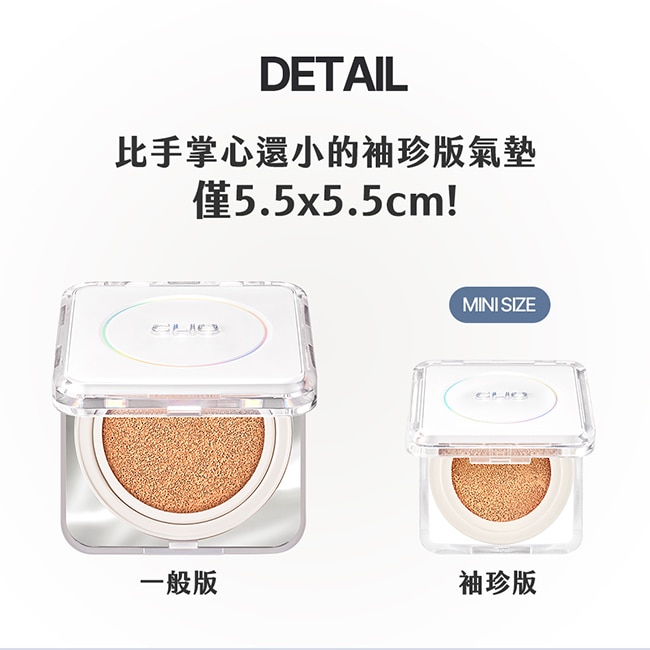 產品特色5.5x5.5cm迷你袖珍款小巧可愛方便隨身攜帶!讓美麗沒有界限超越膚質、超越妝感跨越底妝新紀元#迷你月光盒 一顆近乎任何人都適合的萬能百搭氣墊粉餅空氣輕盈質地+微霧緞光妝感打造宛若裸肌般的完美質感秒變韓系高級感原生感透明肌