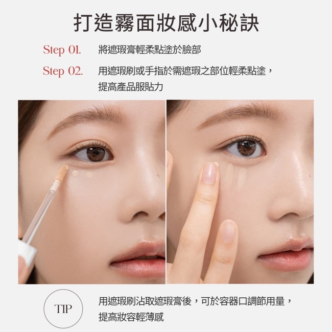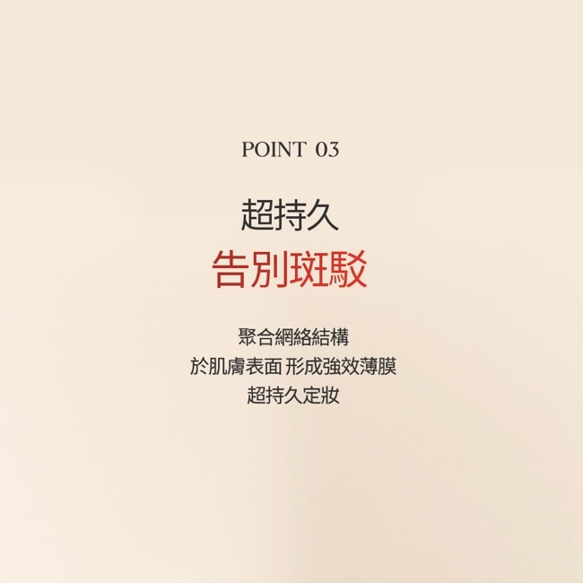 3. 持久遮瑕一筆定妝聚合網絡結構能於肌膚表面形成強效薄膜達到持久定妝效果。