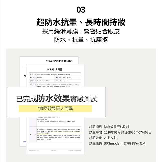 採用絲滑薄膜緊密貼合眼皮防水、抗汗、抗油抗摩擦不暈染。