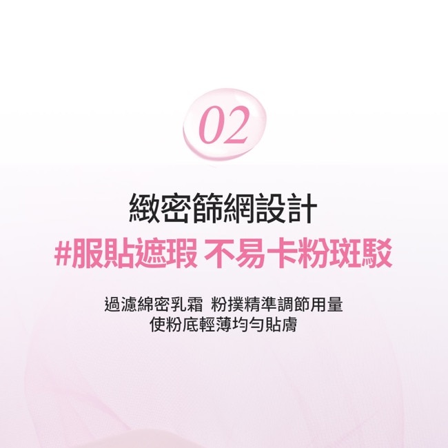 乳霜質地服貼遮瑕綿密質地加篩網設計可使底妝均勻貼合肌膚、細緻遮瑕搭配彈性成膜技術長時間袋裝也不易卡粉、斑駁。