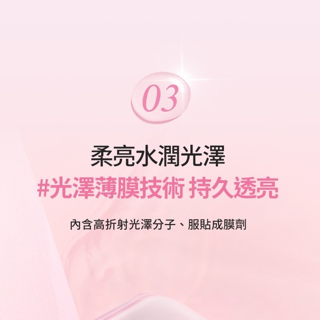 光澤薄膜技術持久透亮內含高折射光澤分子、服貼成膜劑採用光澤薄膜技術使妝容持久亮澤。