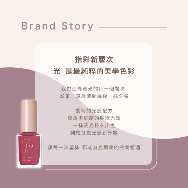 使用前請先要搖勻,請用毛刷沾取適量指彩,塗抹於指甲上。1~2層更飽和。