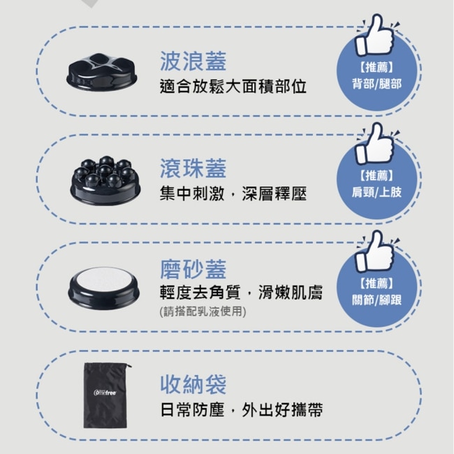 波浪蓋 / 滾珠蓋 / 磨砂蓋三款按摩頭配件可更換針對各部位深層放鬆