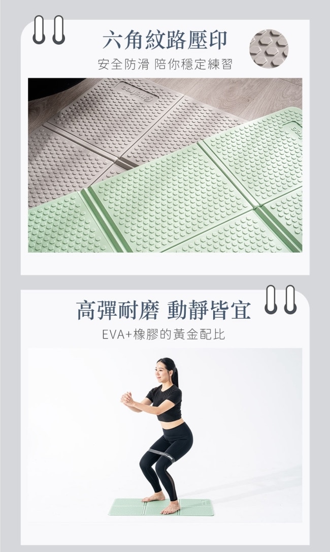 EVA+天然橡膠材質止滑親膚運動使用更安全。
