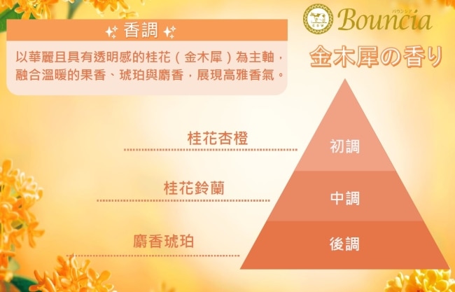 以華麗且具有透明感的桂花金木犀為主軸融合溫暖的果香、琥珀與麝香展現高雅香氣。