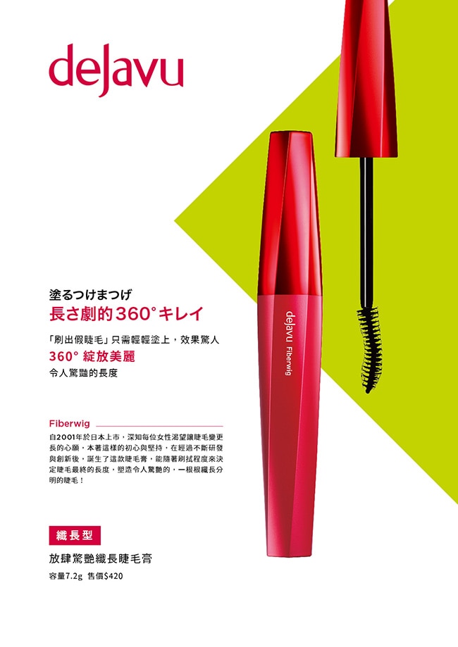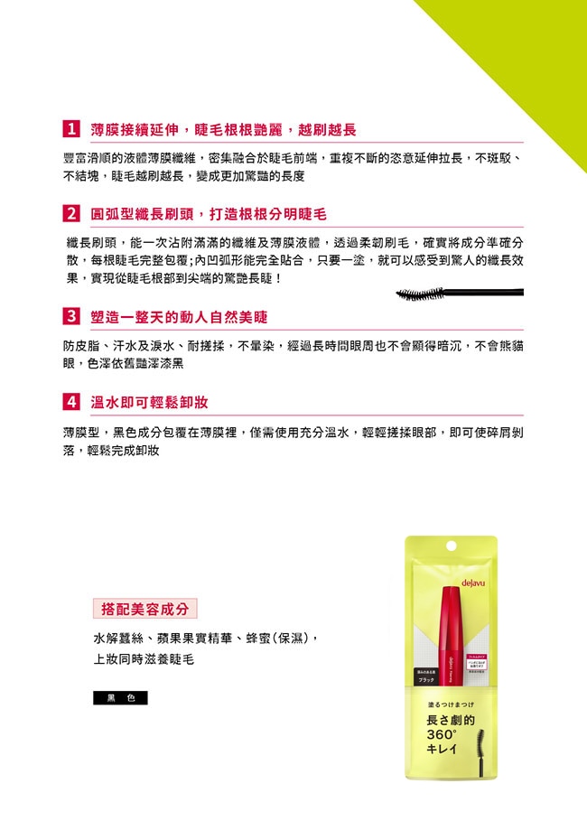 dejavu刷出假睫毛系列纖長型能塑造出如同假睫毛般完美纖長的睫毛妝感。全新改版後刷頭沾取豐富的薄膜纖維融合於睫毛前端密集包覆延伸更加滑順有光澤! 睫毛越刷越長!