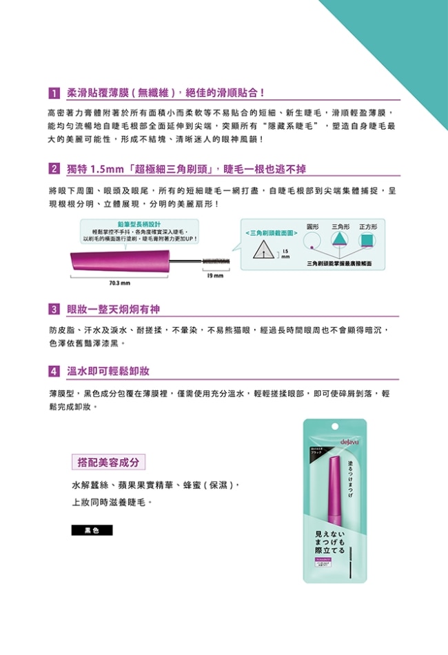 dejavu刷出假睫毛系列立體分明型具有高延展性柔滑薄膜能完美附著於所有短細、新生等“隱藏系睫毛”使睫毛呈現有如天生的自然美麗扇形根根分明展現迷人眼神。
