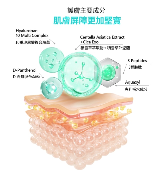 | 主打成分 | 菸鹼醯胺/積雪草葉萃取 + 積雪草泌活/多重玻尿酸/胜肽複合物 |