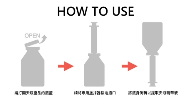 | 使用方法 | 打開瓶身上方的白色瓶蓋。 取下吸取管的蓋子,將吸取管插入瓶口的橡膠孔中。 將瓶身倒置,輕輕拉起吸取管吸取精華液。 均勻塗抹於臉部肌膚,輕拍至吸收。 使用後可將吸取管繼續插在瓶口,並常溫保存。 |