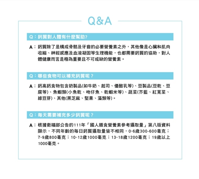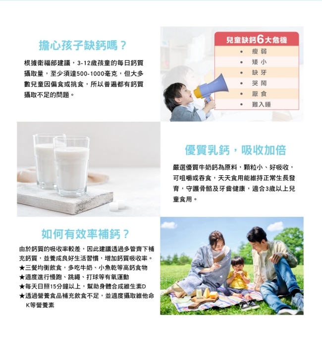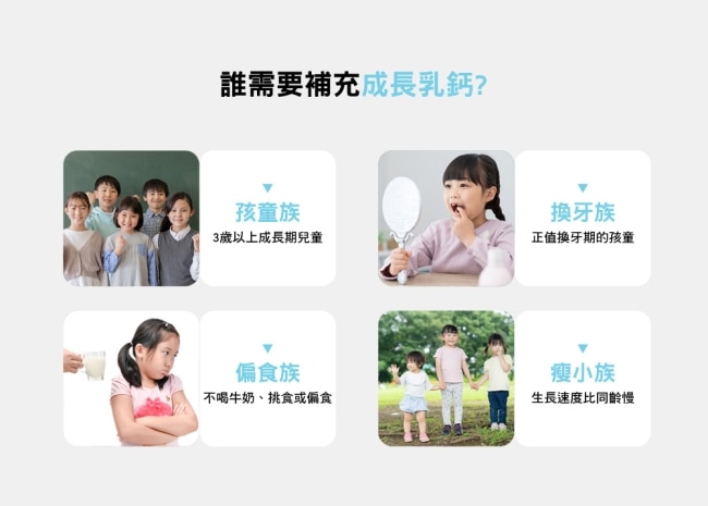 根據衛福部建議4-13歲的孩童每天至少要攝取600-1200毫克的鈣質。雖然飲食中存在許多富含鈣質的食物但由於大多數兒童都有偏食或挑食的習慣所以特別容易發生鈣質攝取不足的問題。建議除了攝取均衡的飲食之外也不妨透過營養食品來加強補充鈣質。