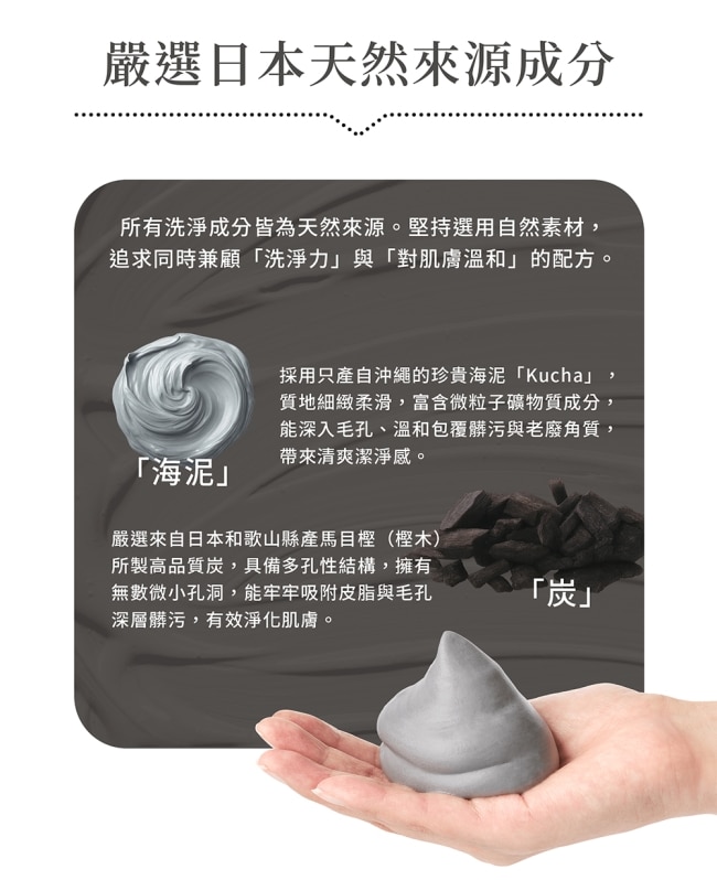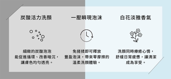 | 商品簡述 | 輕輕一壓、即能擁有綿密炭酸泡沫,海泥與炭能吸附毛孔髒污,洗出清爽透亮素肌 |
