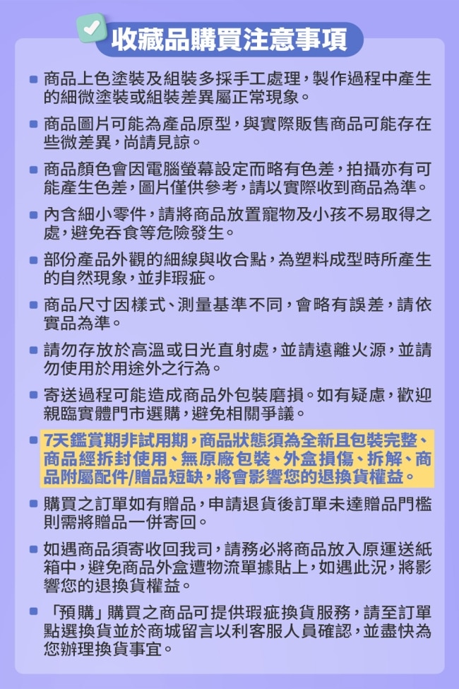 玩具屬於大量生產之工業產品,難免會有部分塗裝上之差異,如有出現嚴重瑕疵將會針對狀況另做退貨判斷。