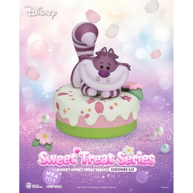 柴郡貓 (Cheshire Cat)露出招牌壞笑,趴在鋪滿玫瑰花瓣的奶油蛋糕上,頑皮又充滿魅力